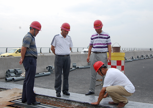 7月1日,在举国欢庆,喜迎建党90周年之际,总公司总经理罗业凤以及总公司副总经理、二分公司总经理庞博新来到袍江大桥施工现场,给大桥全体员工加油鼓劲,为项目施工进行入最后冲刺、实现按计划通车任务出谋划策,极大地鼓舞了项目员工的事情热情;