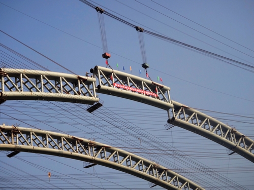 郁江特大桥为中承式桁式钢管混凝土拱桥 ,主跨净跨270米 ,上下游拱肋共分24节段装置 ,最大节段重81吨 。2012年8月18日正式开始拱肋吊装施工 ,9月22日大桥实现上游合龙 ,9月27日全桥合龙 ,拱肋吊装共历时42天 。在拱肋吊装施工期间 ,项目部员工充分利用旱季施工的契机 ,起早贪黑、齐心协力 ,努力克服高温施工、高空施工及台风雨水天气频繁等倒运条件的影响 ,精心组织 ,科学安排事情时间 ,准确、顺利地完成了全桥的拱肋装置 。大桥拱肋顺利合龙 ,标记着大桥已完成施工难度最大的工序 ,为下步钢管拱混凝土浇筑,吊杆、横梁及桥面系的装置施工打下坚实的基础 。