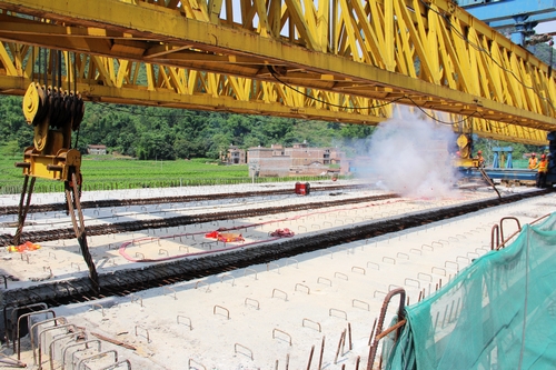 图为那学大桥完成最后一片箱梁架设