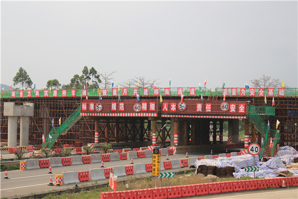 古辣互通M匝道桥为项目唯一一座跨高速现浇桥,第二跨、第三跨跨越柳南高速公路。本桥为拆除新建桥梁,桥长106.4m。结合本项目车流量大、边通车边施工等特点,该桥接纳门洞支架施工工艺,第一跨、第四跨接纳满堂碗扣式支架。